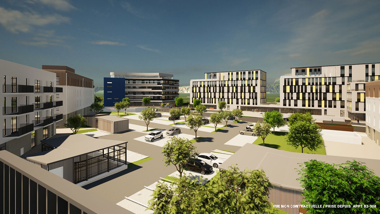 Le « Cœur des crêtes » est un ensemble architectural harmonieux composé de 3 immeubles résidentiels, 2 immeubles de bureaux et des commerces en rez-de-chaussée, s'articulant autour d'une place centrale conviviale. Projet de 75 logements conçu avec une attention particulière à l'intégration urbaine et à la qualité de vie des futurs résidents, chaque bâtiment a été pensé pour offrir des espaces de vie lumineux, fonctionnels et confortables, tout en respectant les normes environnementales les plus strictes. Les balcons et terrasses sont spacieux et optimisés pour profiter d'espaces extérieurs privés tout en maximisant l'entrée de lumière naturelle. Les informations sur les risques auxquels ce bien est exposé sont disponibles sur le site Géori...