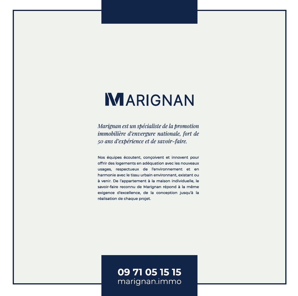Marignan est un spécialiste de la promotion immobilière d’envergure nationale fort de 50 ans d’expérience et de savoir-faire. À travers notre réseau de 13 agences, Marignan est implanté dans toutes les grandes métropoles régionales. Cet ancrage local historique confère à nos équipes une compréhension fine des enjeux des territoires, des besoins des collectivités et des attentes de nos clients. Grand nom de la promotion immobilière, Marignan offre une gamme de produits et services en constante évolution et imagine des espaces de vie toujours plus innovants, désirables et durables. Notre cœur de métier est l’habitat, qu’il soit collectif ou individuel. Notre ambition est d’offrir un cadre de vie qui réponde aux besoins spécifiques de ceux qui y habitent et qui s’adapte aux usages évolutifs du logement. Nous ajoutons à ce savoir-faire historique l’immobilier d’entreprise pour penser et réaliser des espaces en adéquation avec les nouveaux modes de travail.