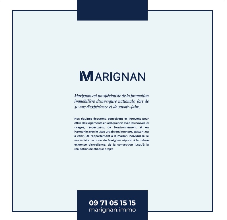 Marignan est un spécialiste de la promotion immobilière d’envergure nationale fort de 50 ans d’expérience et de savoir-faire. À travers notre réseau de 13 agences, Marignan est implanté dans toutes les grandes métropoles régionales. Cet ancrage local historique confère à nos équipes une compréhension fine des enjeux des territoires, des besoins des collectivités et des attentes de nos clients. Grand nom de la promotion immobilière, Marignan offre une gamme de produits et services en constante évolution et imagine des espaces de vie toujours plus innovants, désirables et durables. Notre cœur de métier est l’habitat, qu’il soit collectif ou individuel. Notre ambition est d’offrir un cadre de vie qui réponde aux besoins spécifiques de ceux qui y habitent et qui s’adapte aux usages évolutifs du logement. Nous ajoutons à ce savoir-faire historique l’immobilier d’entreprise pour penser et réaliser des espaces en adéquation avec les nouveaux modes de travail.