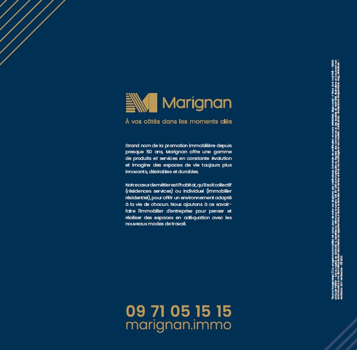 Marignan est un spécialiste de la promotion immobilière d’envergure nationale fort de 50 ans d’expérience et de savoir-faire. À travers notre réseau de 13 agences, Marignan est implanté dans toutes les grandes métropoles régionales. Cet ancrage local historique confère à nos équipes une compréhension fine des enjeux des territoires, des besoins des collectivités et des attentes de nos clients. Grand nom de la promotion immobilière, Marignan offre une gamme de produits et services en constante évolution et imagine des espaces de vie toujours plus innovants, désirables et durables. Notre cœur de métier est l’habitat, qu’il soit collectif ou individuel. Notre ambition est d’offrir un cadre de vie qui réponde aux besoins spécifiques de ceux qui y habitent et qui s’adapte aux usages évolutifs du logement. Nous ajoutons à ce savoir-faire historique l’immobilier d’entreprise pour penser et réaliser des espaces en adéquation avec les nouveaux modes de travail.
