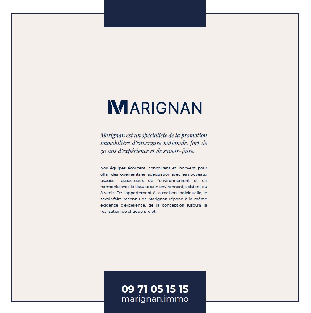 Marignan est un spécialiste de la promotion immobilière d’envergure nationale fort de 50 ans d’expérience et de savoir-faire. À travers notre réseau de 13 agences, Marignan est implanté dans toutes les grandes métropoles régionales. Cet ancrage local historique confère à nos équipes une compréhension fine des enjeux des territoires, des besoins des collectivités et des attentes de nos clients. Grand nom de la promotion immobilière, Marignan offre une gamme de produits et services en constante évolution et imagine des espaces de vie toujours plus innovants, désirables et durables. Notre cœur de métier est l’habitat, qu’il soit collectif ou individuel. Notre ambition est d’offrir un cadre de vie qui réponde aux besoins spécifiques de ceux qui y habitent et qui s’adapte aux usages évolutifs du logement. Nous ajoutons à ce savoir-faire historique l’immobilier d’entreprise pour penser et réaliser des espaces en adéquation avec les nouveaux modes de travail.